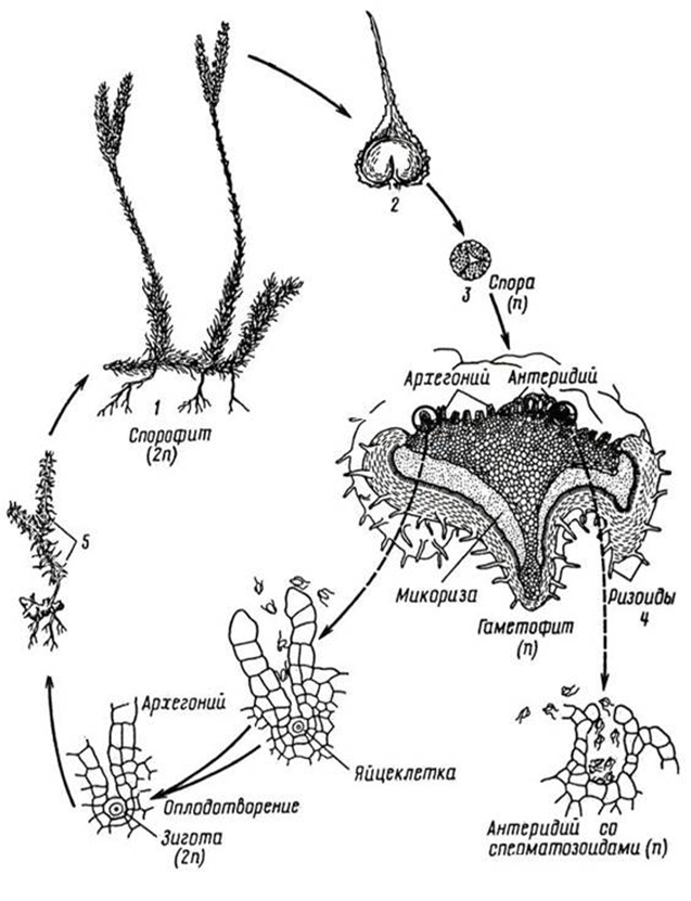 ![Антеридии и архегонии Кукушкин лен]()