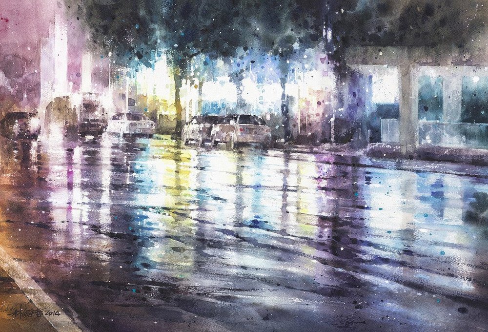 ![Дождливый город акварелью]()