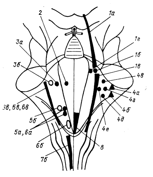 ![Схему расположения ядер v–XII пар черепных нервов в ромбовидной ямке]()
