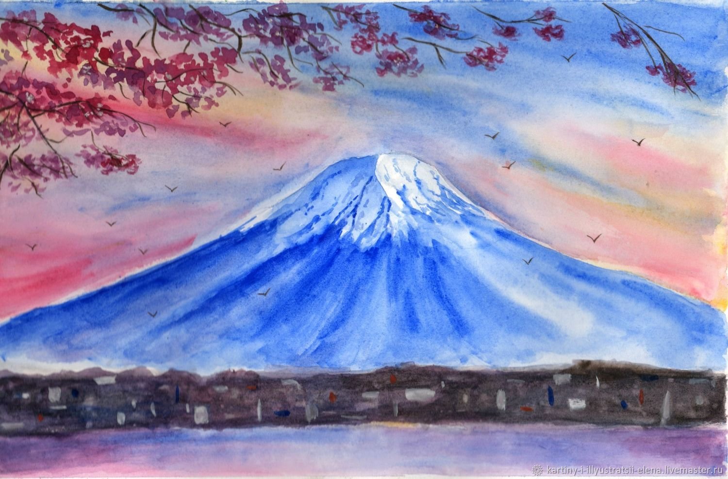 ![Гора Фудзи акварель]()