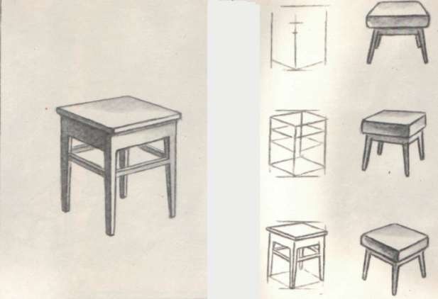 ![Линейно-конструктивный рисунок табурета]()