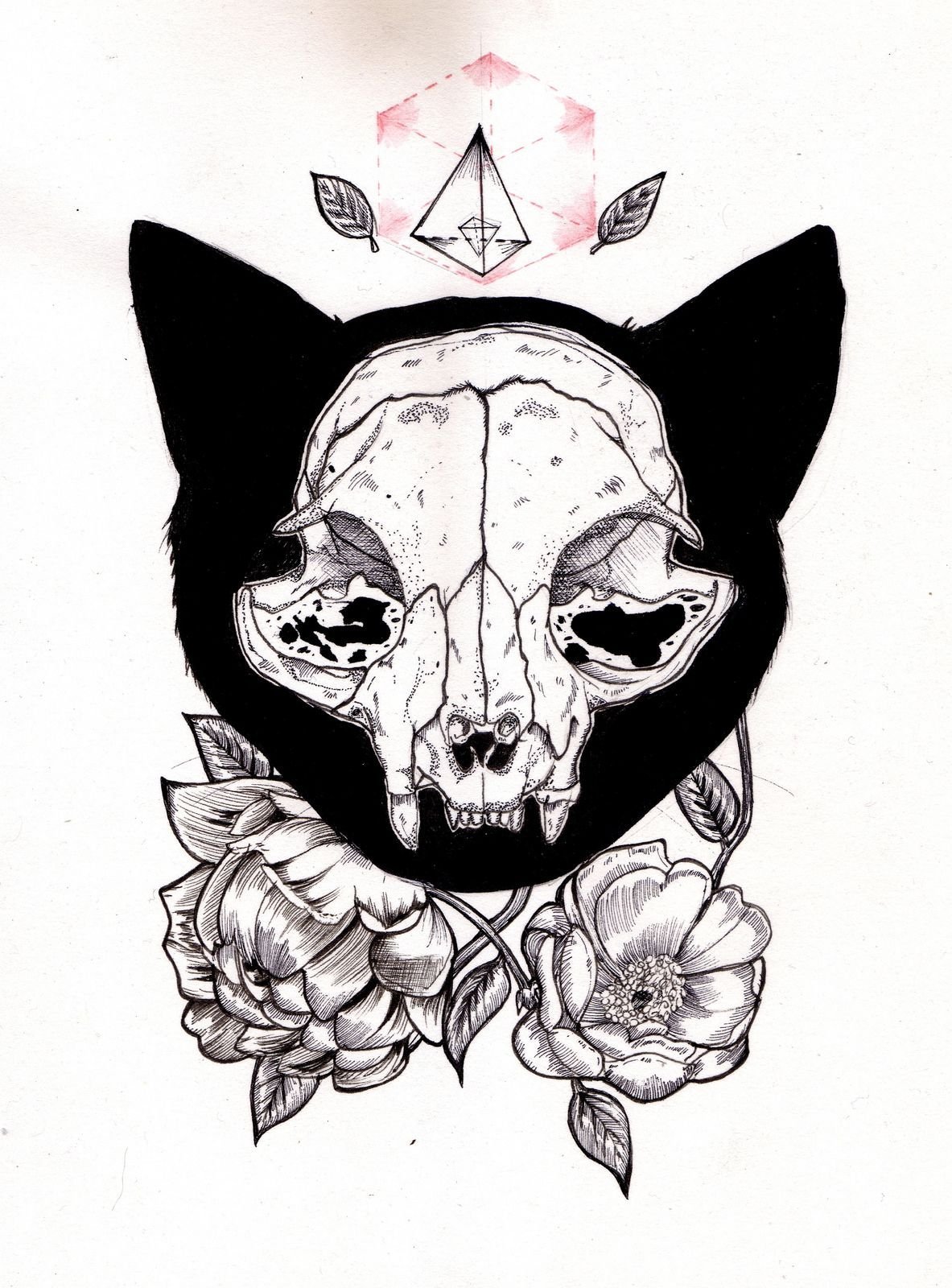 ![Череп кота эскиз тату]()