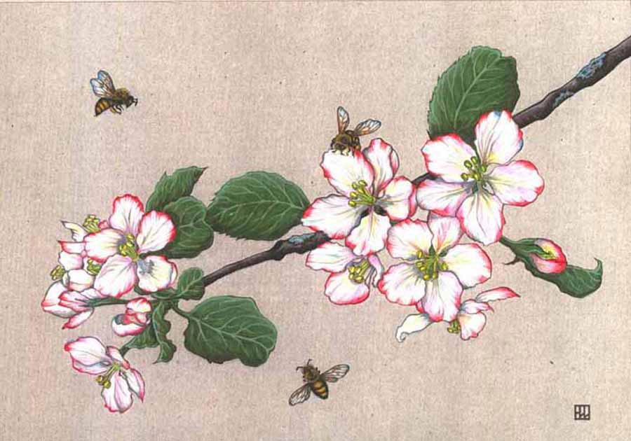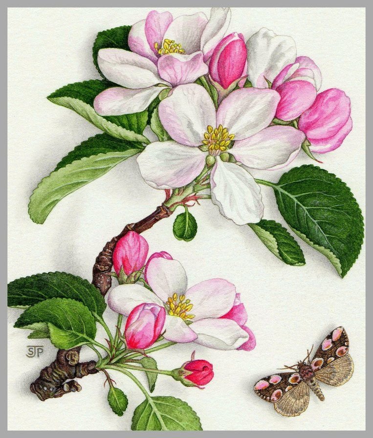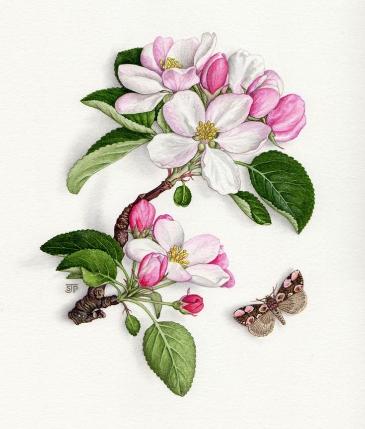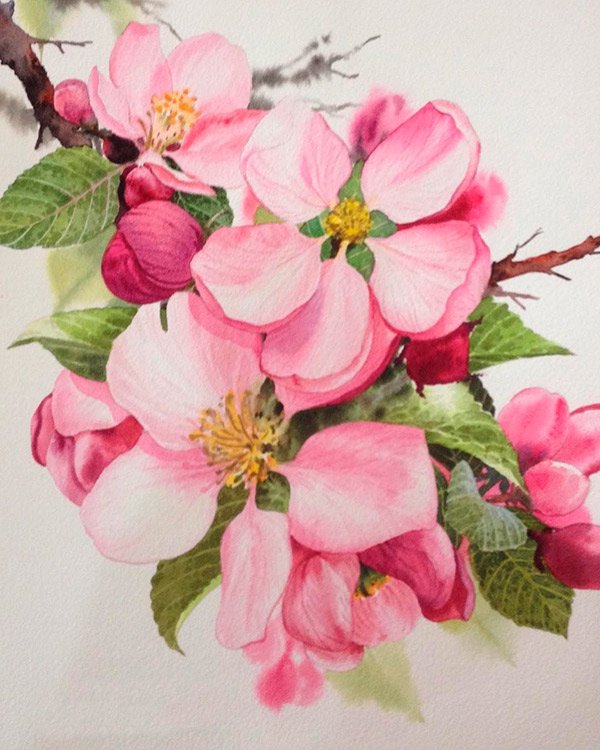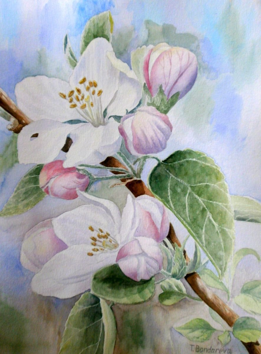 ![Ветка цветущей яблони акварель Ольги Абакумовой]()