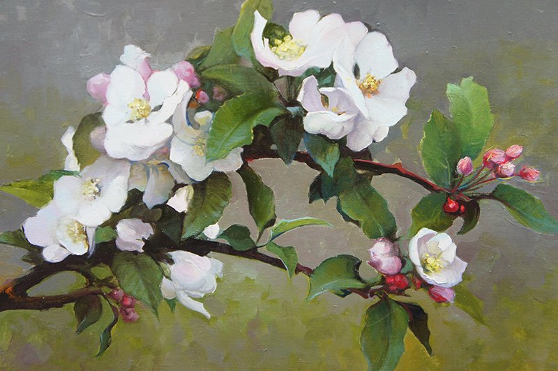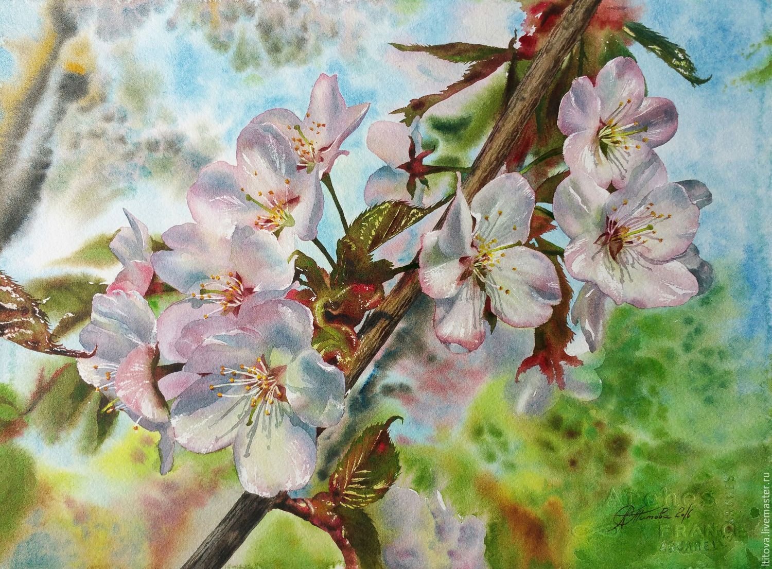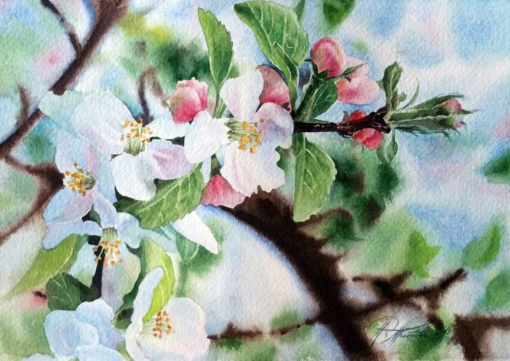 Ветка цветущей яблони акварель Ольги Абакумовой