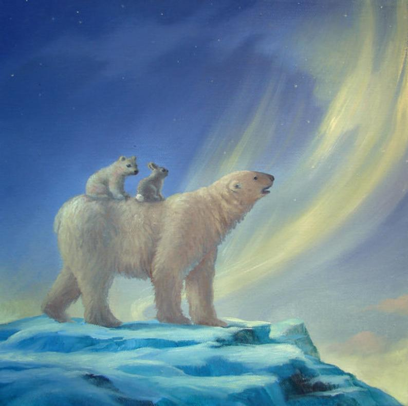 Рисование белый медведь и Северное сияние