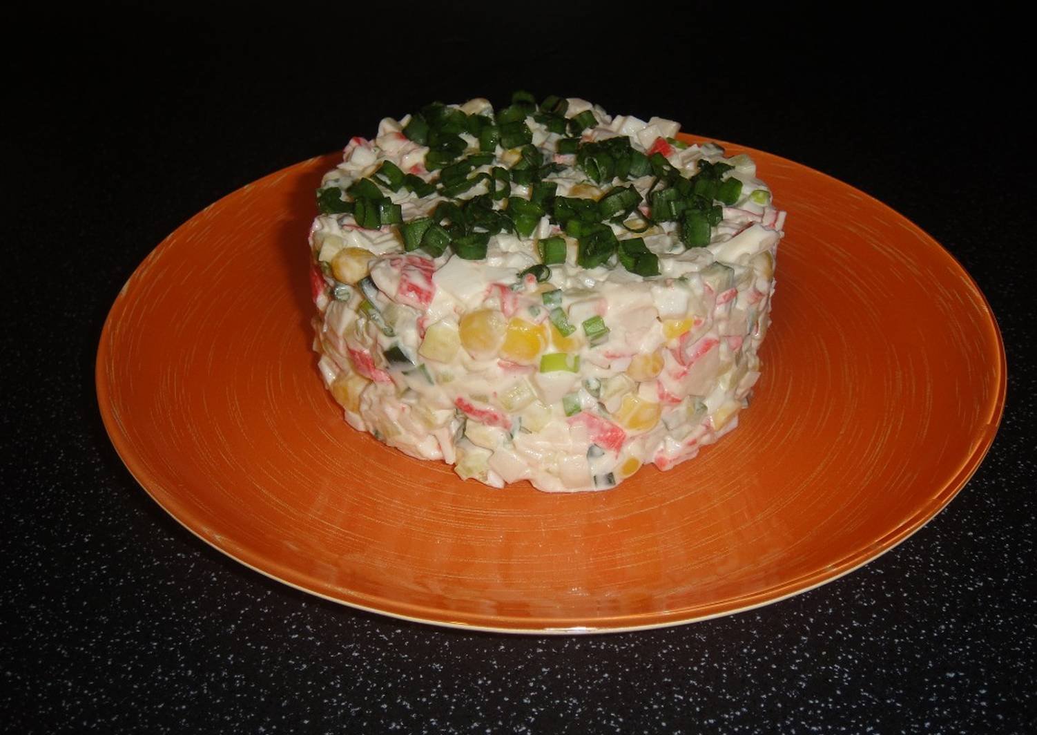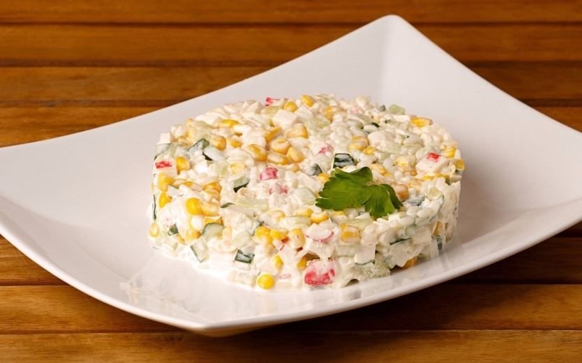 ![Салат с крабовыми палочками и кукурузой и яйцом и рисом]()