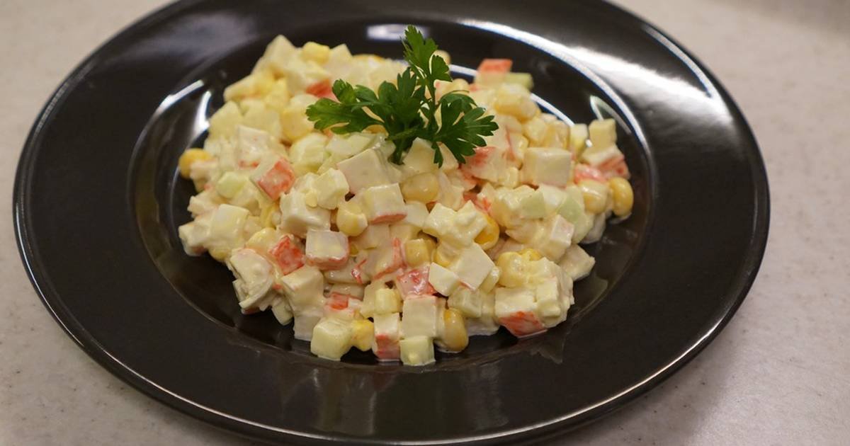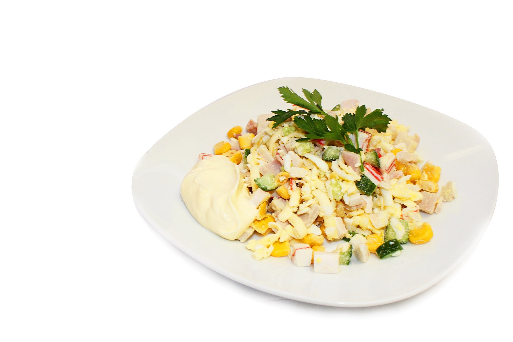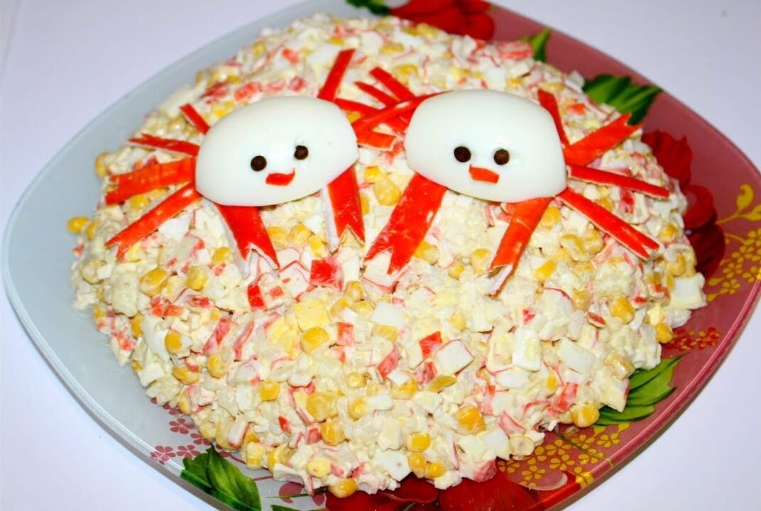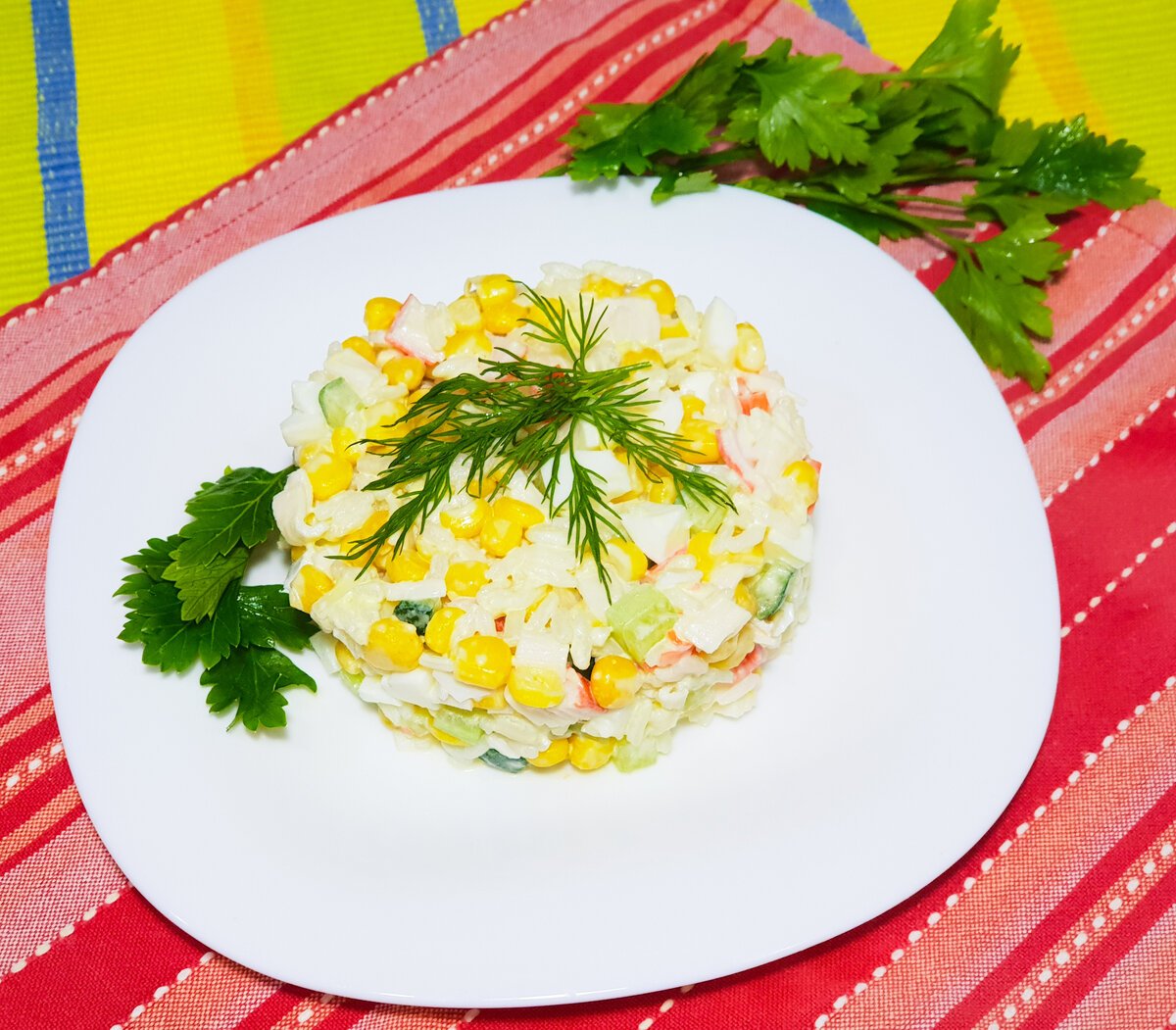 Салат с крабовыми палочками и кукурузой и яйцом и рисом
