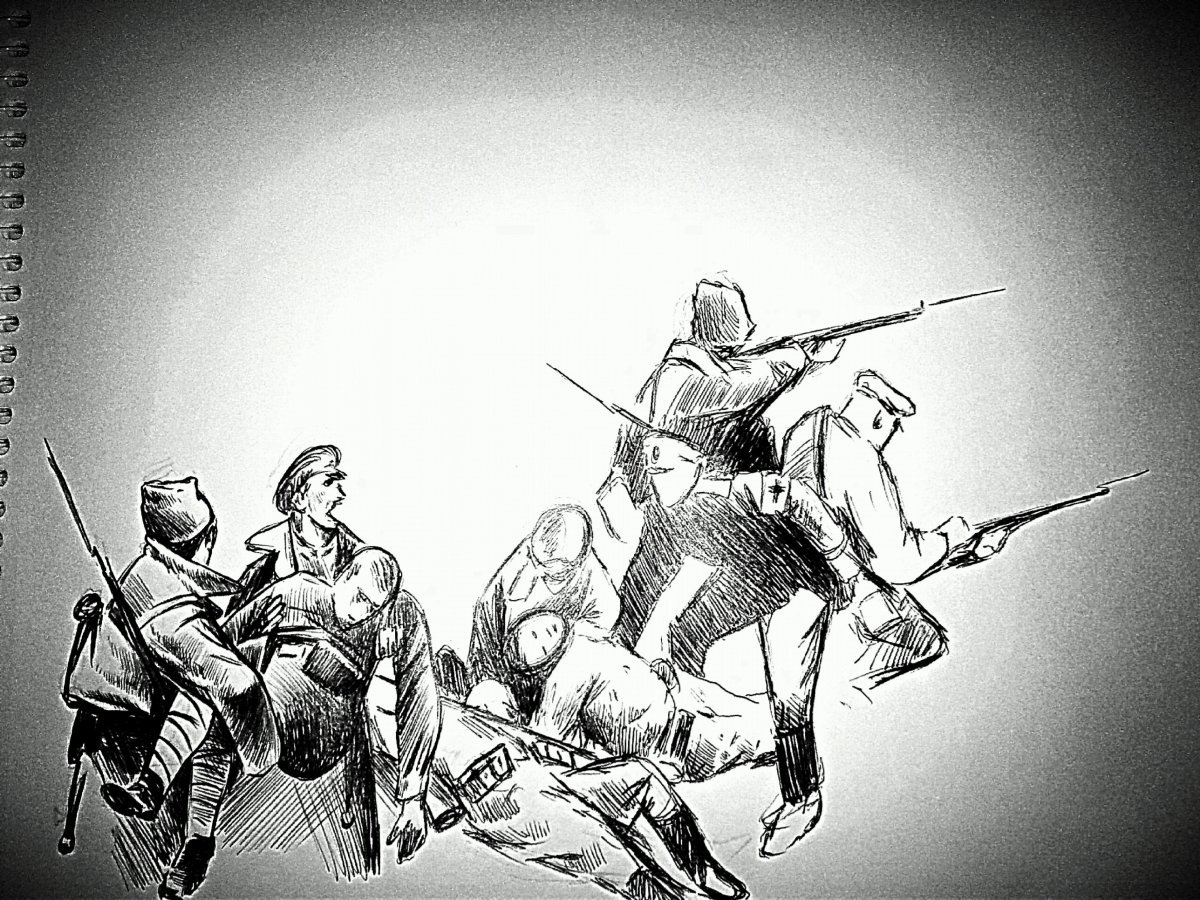 На этом батальном рисунке перед вами развернулась невероятная сцена, полная динамики и эмоций. В центре взора находятся героические фигуры, сражающиеся в жестокой битве. Оружие сверкает на солнце, а каждый движение их тел выражает силу и мощь. Окружающий пейзаж дополняет общую картину: горы, леса и огненные факелы создают особую атмосферу мрачности и напряжения. Возможно, это сражение за свободу или поединок двух могущественных армий – но безусловно, на этом рисунке замечательно передана эпичность и величие батальной сцены.