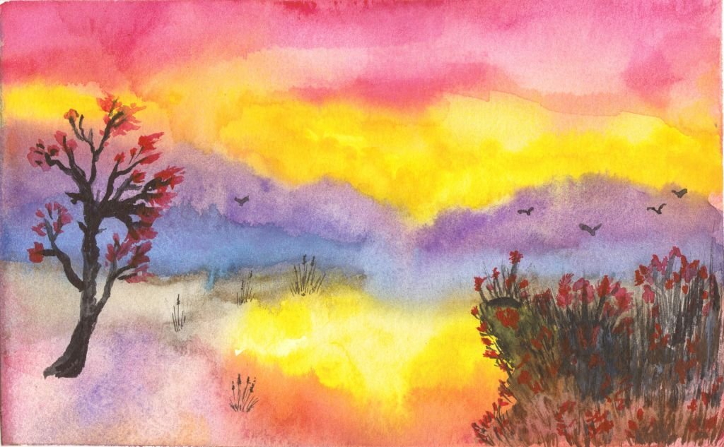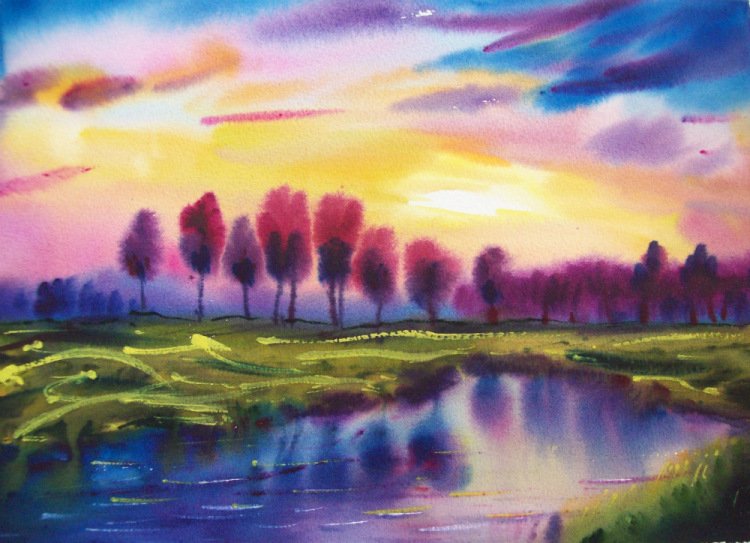 Пейзаж акварелью по мокрому