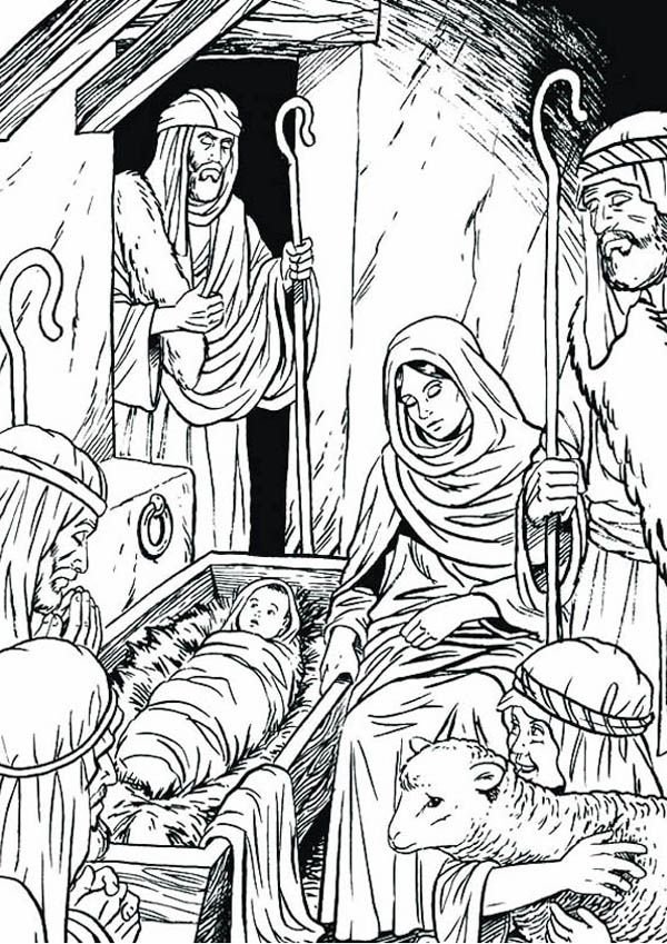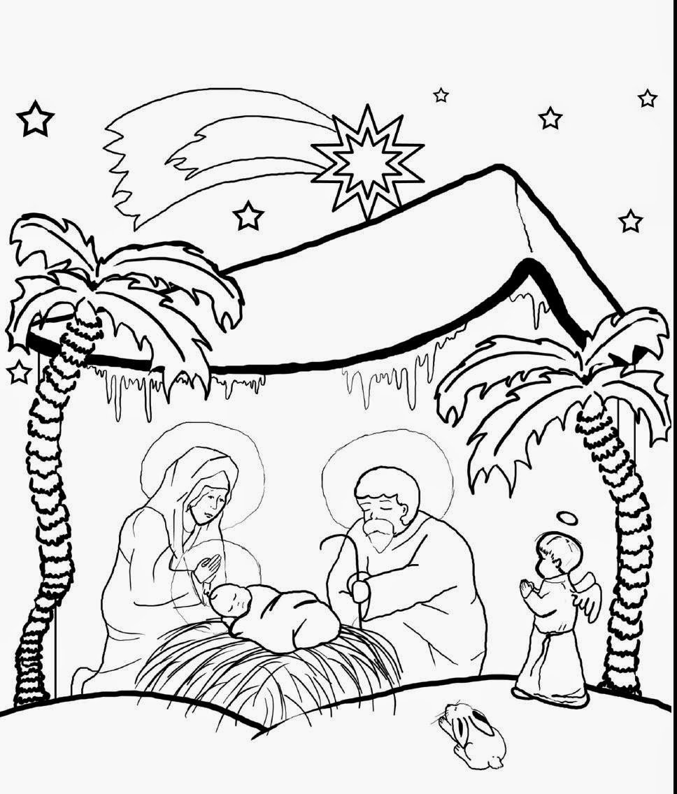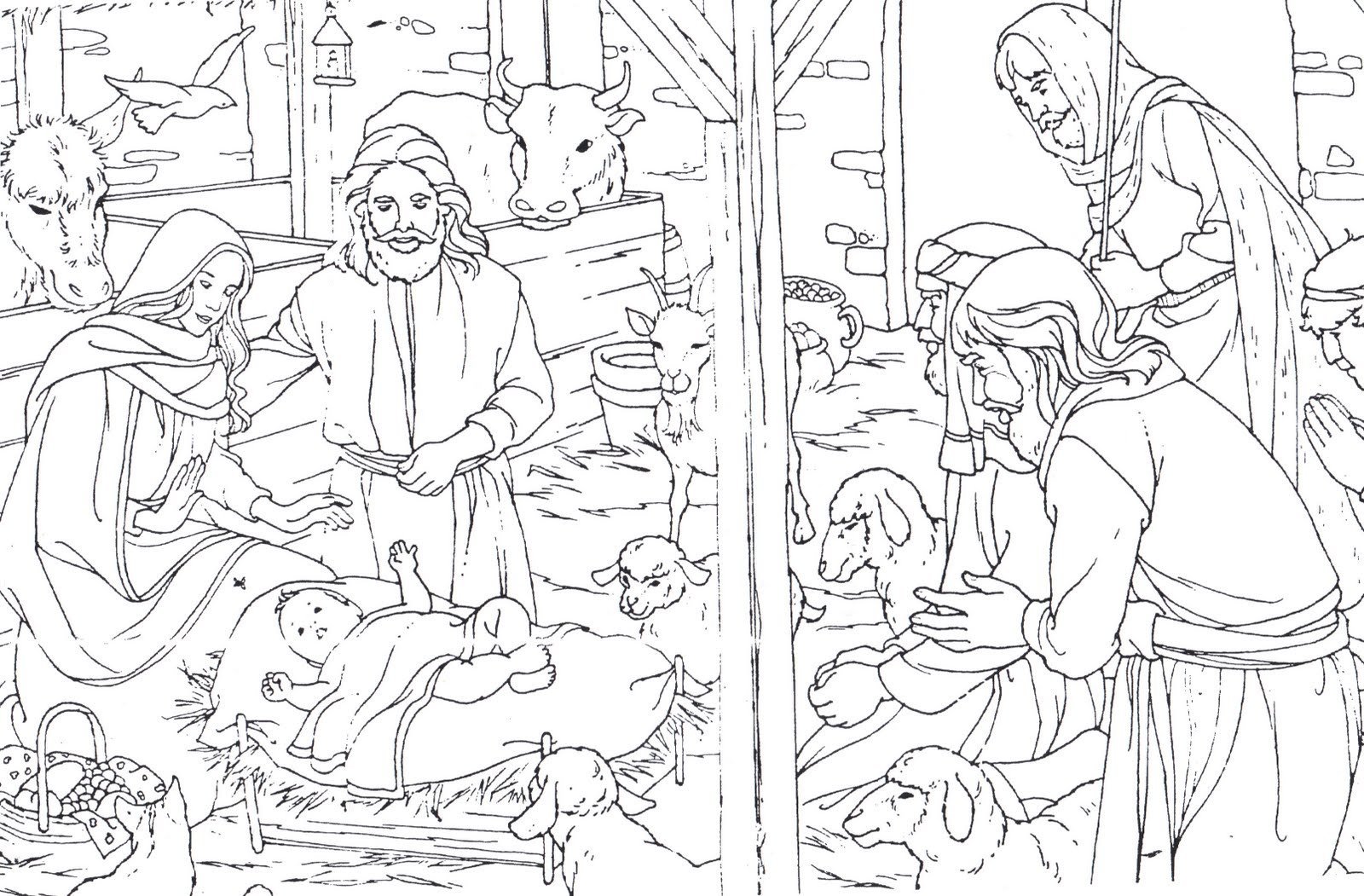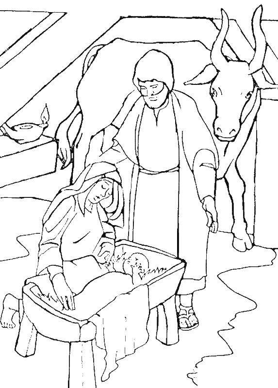 ![Мария, Иосиф и младенец в вертепе раскраска]()
