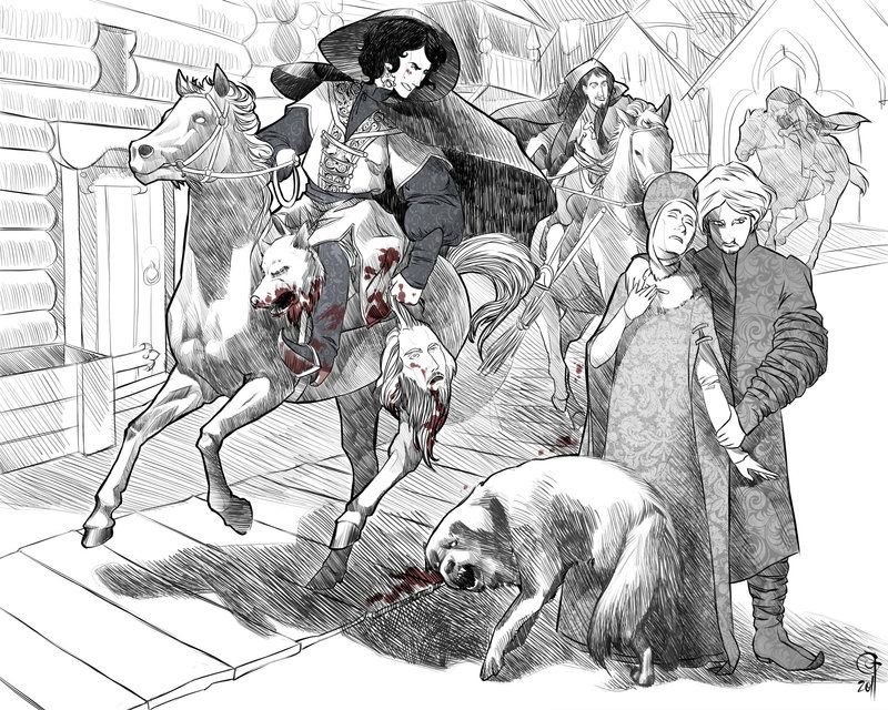 Рисунок "Опричник" представляет собой произведение искусства, которое воплощает сочетание мрачности и символики русской истории. На рисунке изображен опричник - член особой политической организации при Иване Грозном, который отличается своей жестокостью и безжалостностью. Отчетливо видны черты его характера: мрачный взгляд, плащ, закрытый до самого лица, и угрожающая поза. Весь образ опричника пронизан атмосферой страха и подавления. Рисунок вызывает смешанные эмоции, одновременно притягивая и отталкивая зрителя. Он является интересным и неповторимым искусством, способным передать дух времени и вызвать размышления о сложных и противоречивых аспектах истории России.