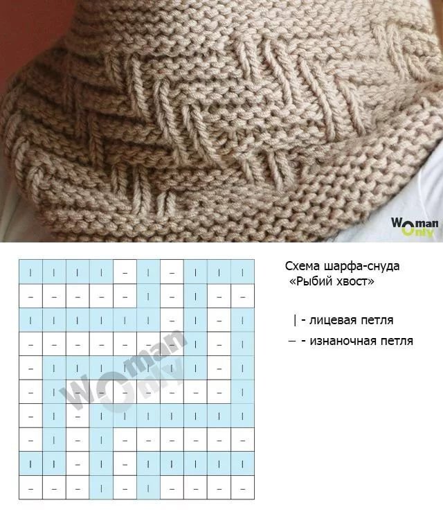 ![Узор рыбий хвост спицами схема и описание для снуда]()