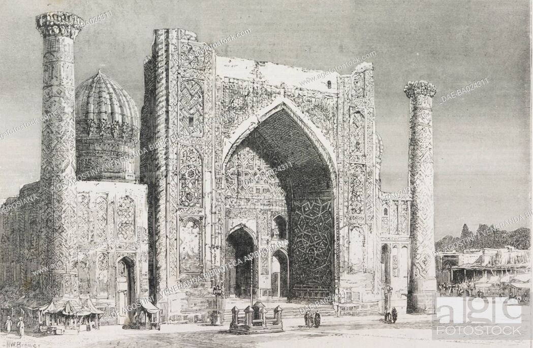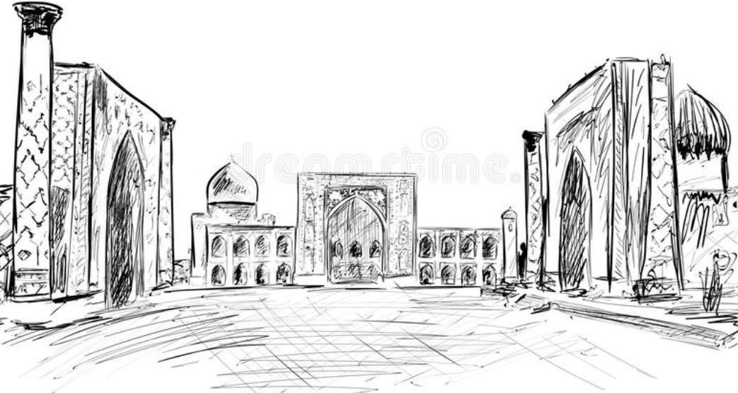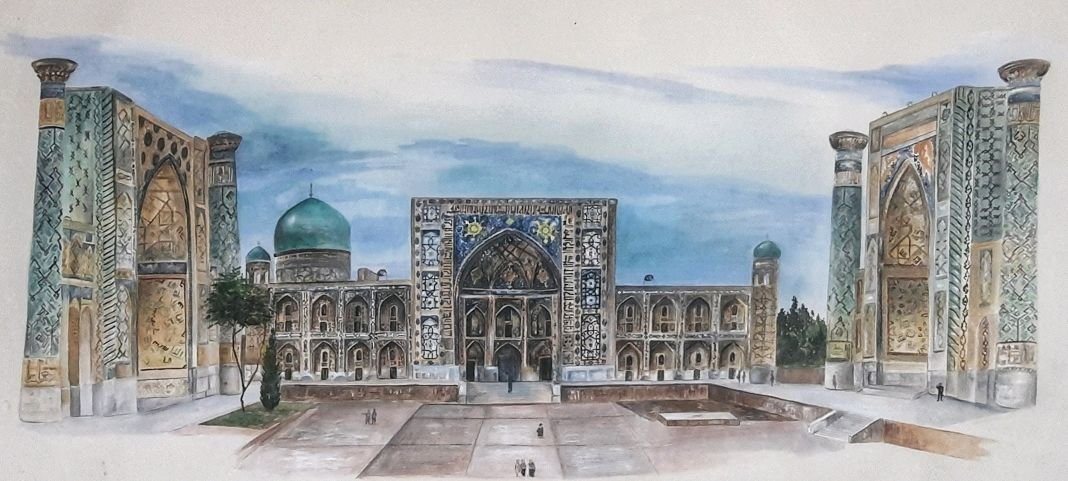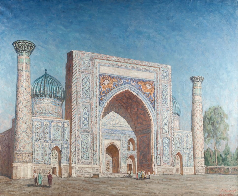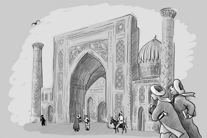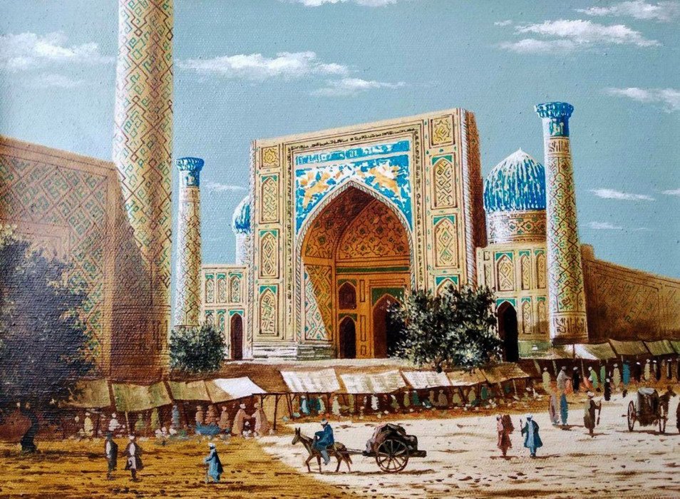 ![Медресе шир-дор на площади Регистан в Самарканде]()