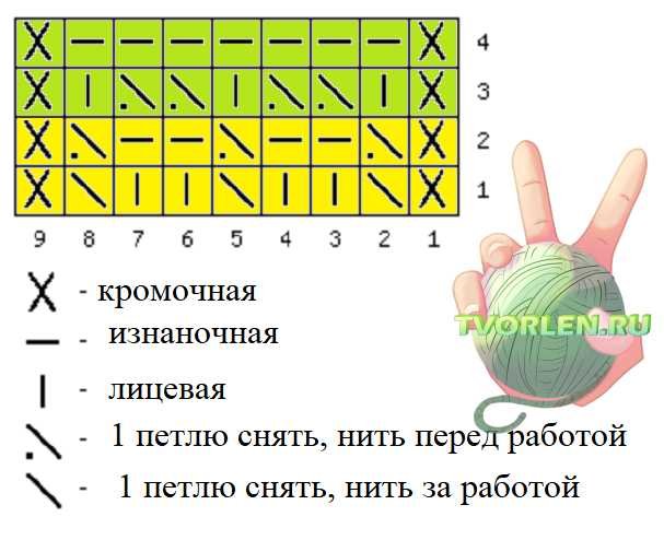 Узор со снятыми петлями спицами схемы и описание