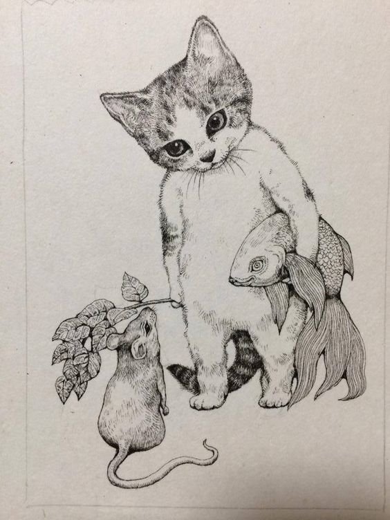 ![Котик черно белый рисунок]()