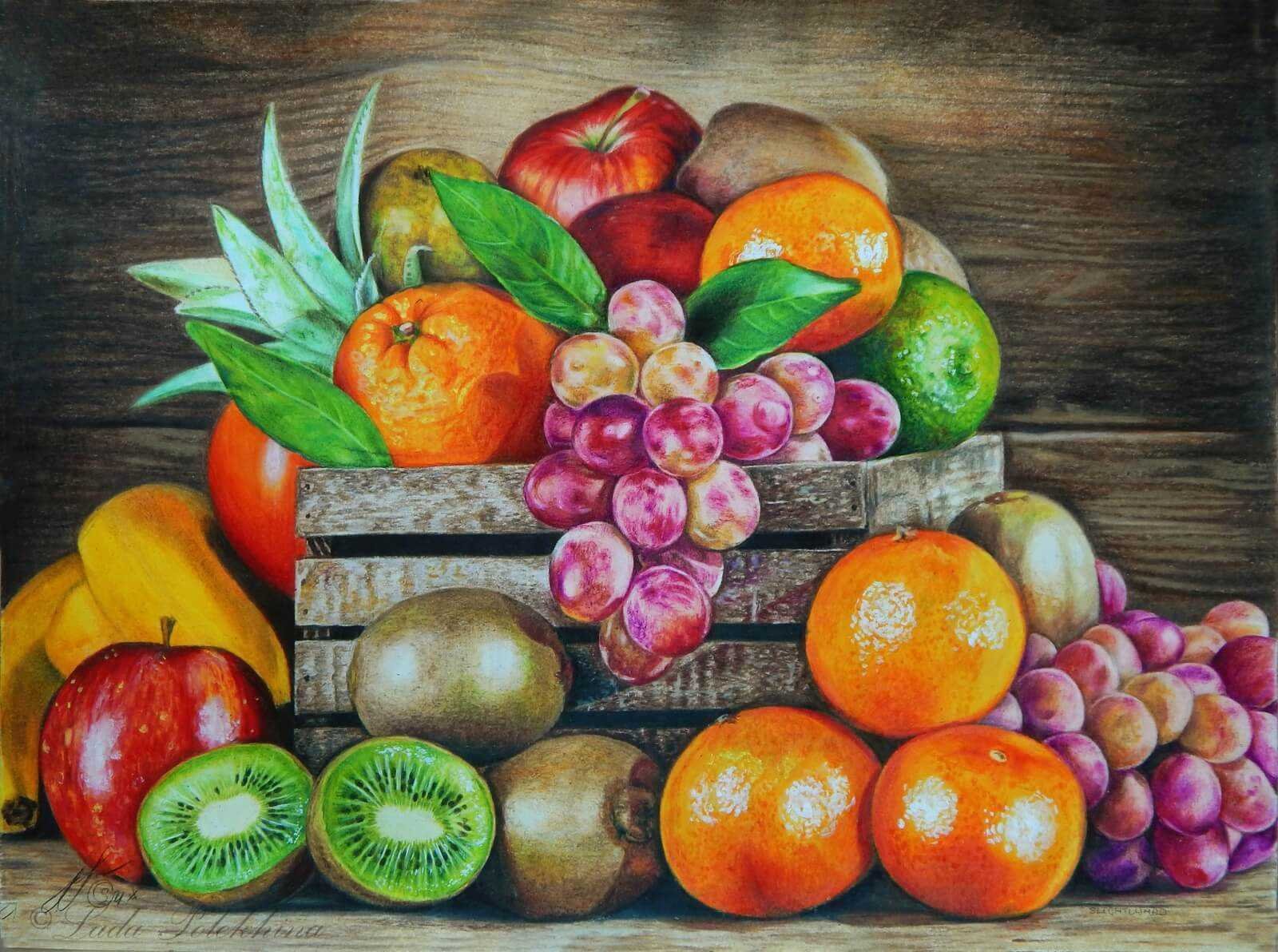 Натюрморт с фруктами цветными карандашами