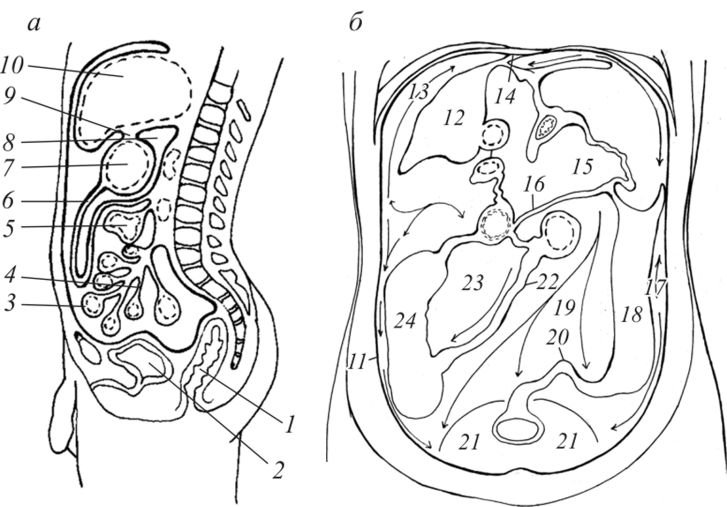 Ход брюшины на сагиттальном сечении