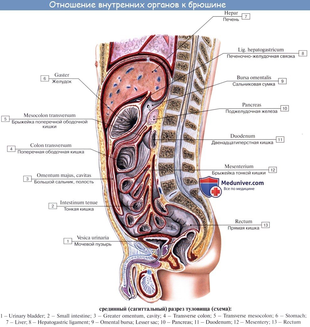 ![Ход брюшины на сагиттальном разрезе живота]()