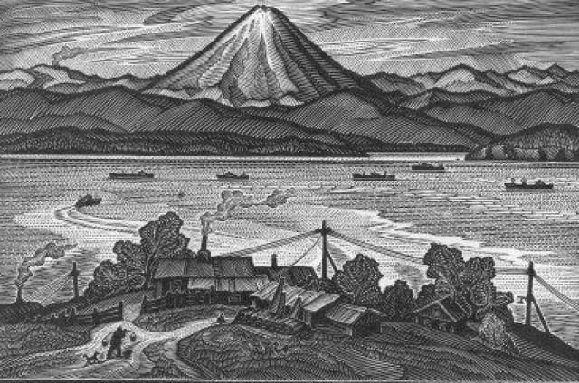 ![Гравюра три вулкана Камчатка]()