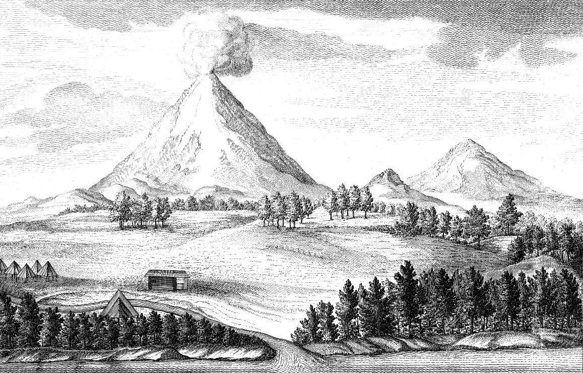 Гравюра три вулкана Камчатка