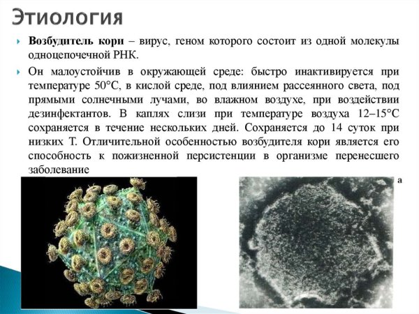 Вирус кори - это высокоинфекционное заболевание, вызываемое вирусом morbili из семейства Paramyxoviridae. Он передается через воздушно-капельный путь и проявляется симптомами, такими как высокая температура, сыпь на коже, кашель, насморк и конъюнктивит. Вирус кори может привести к осложнениям, особенно у детей и взрослых с ослабленной иммунной системой. Поэтому рекомендуется проводить вакцинацию от кори, чтобы предотвратить возможность заражения этим опасным вирусом.