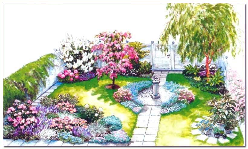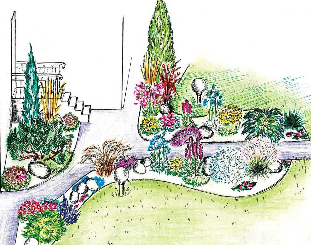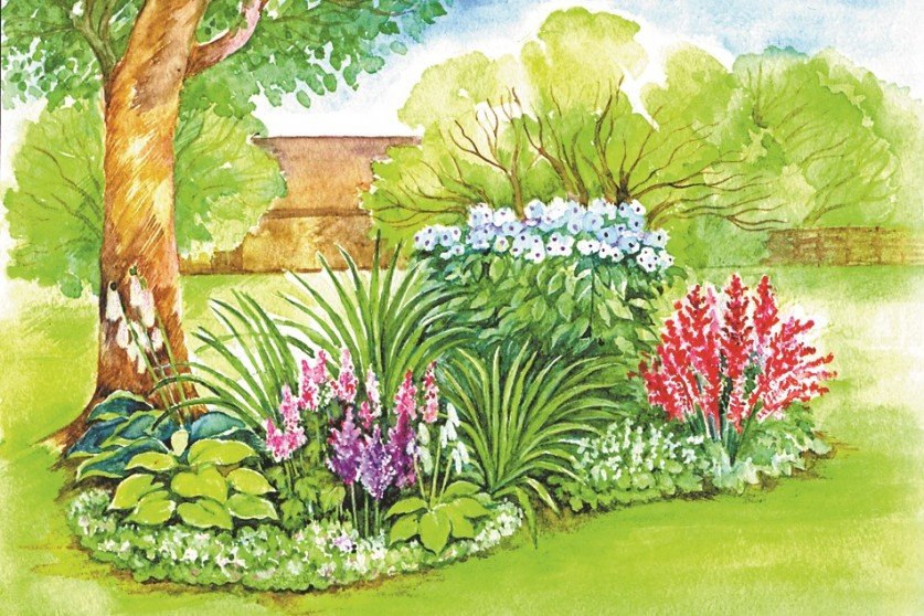 ![Клумба с ирисами и лилейниками и хостами схема]()