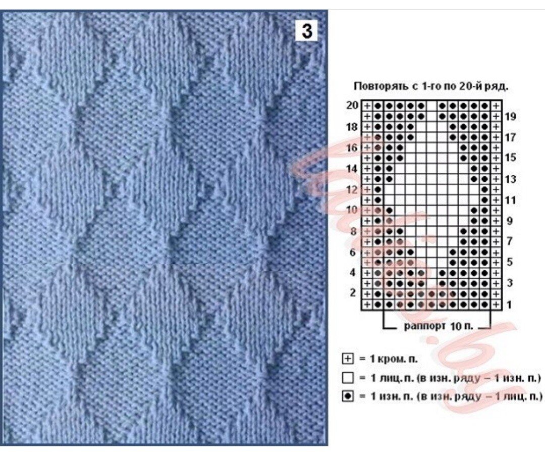 ![Ромбики из лицевых и изнаночных петель с описанием]()