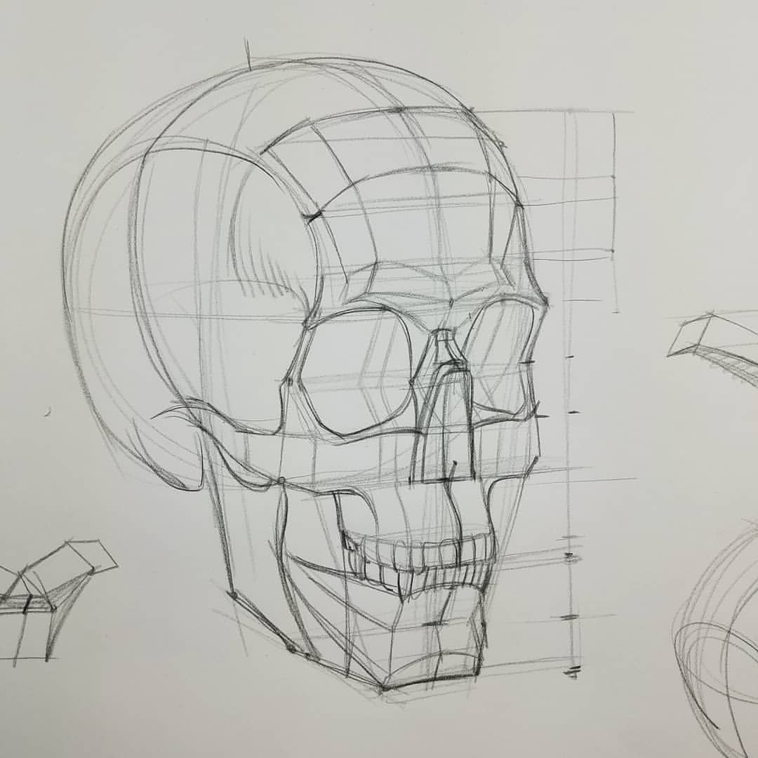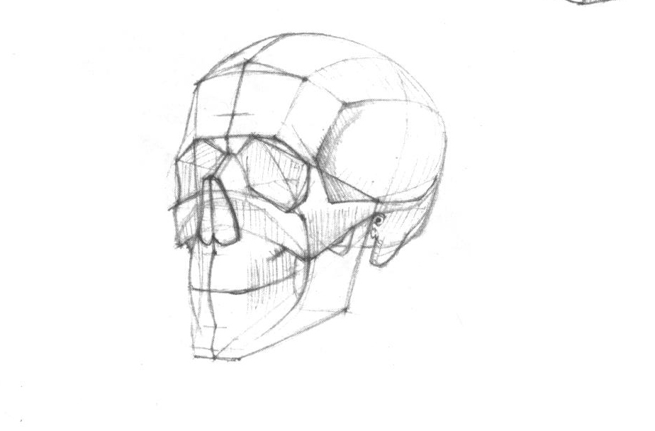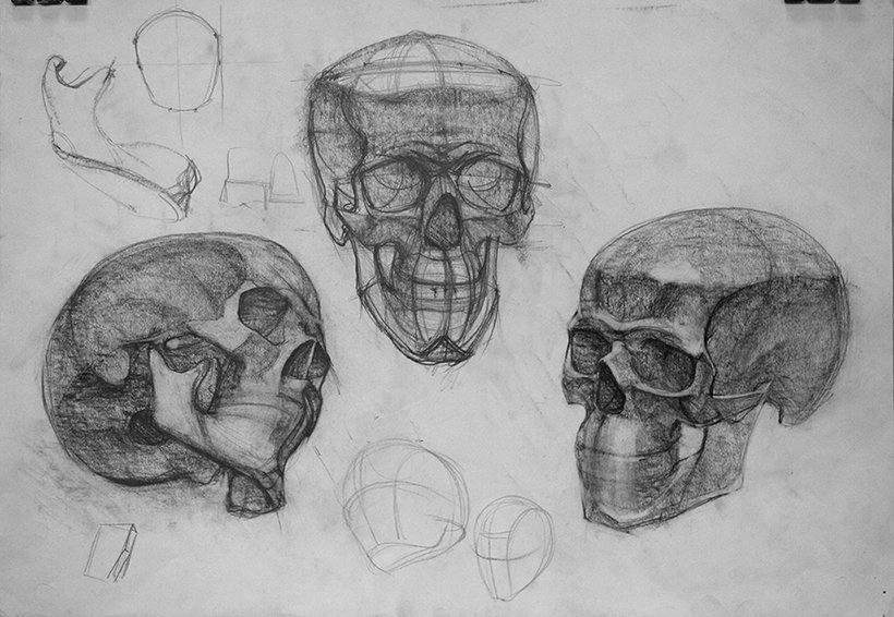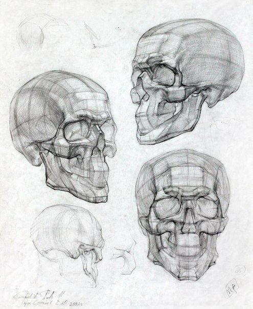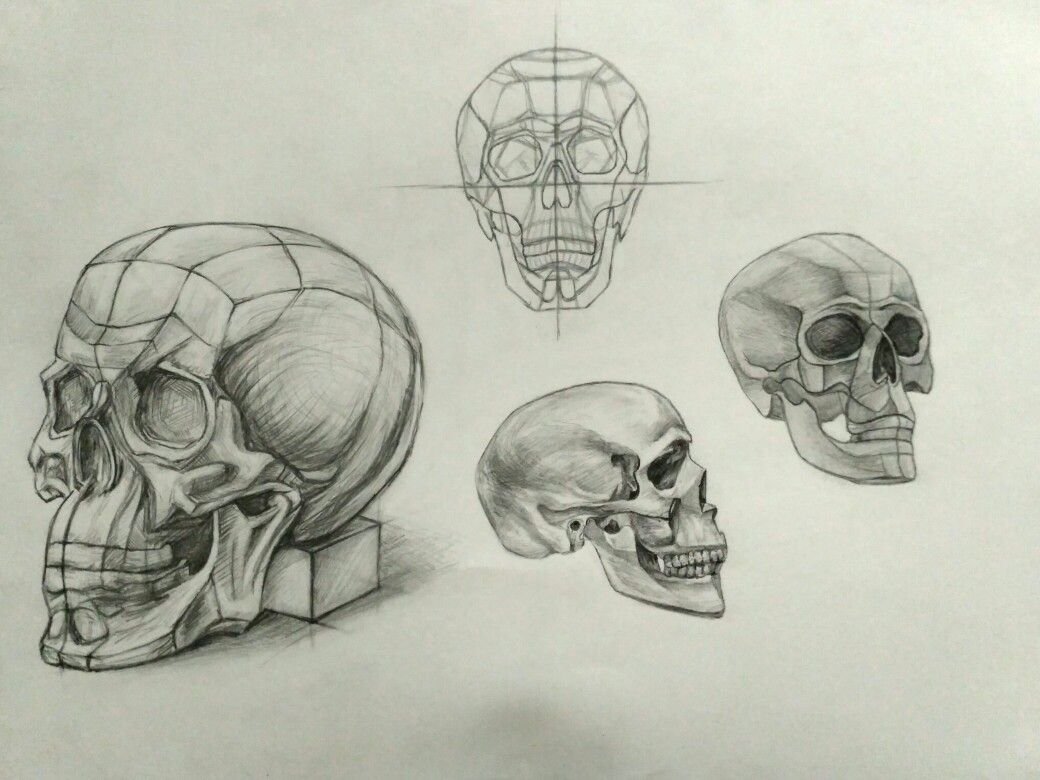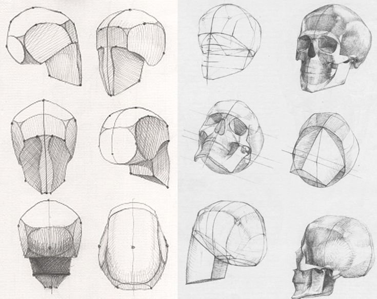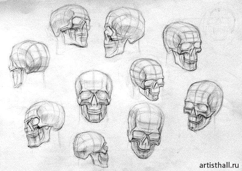Конструктивный рисунок черепа в разных ракурсах