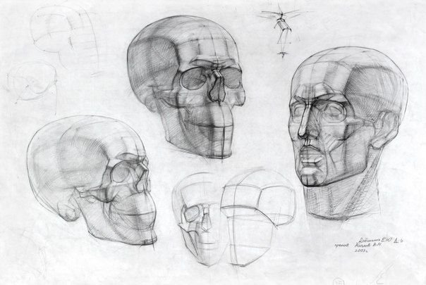 ![Конструктивный рисунок черепа в разных ракурсах]()