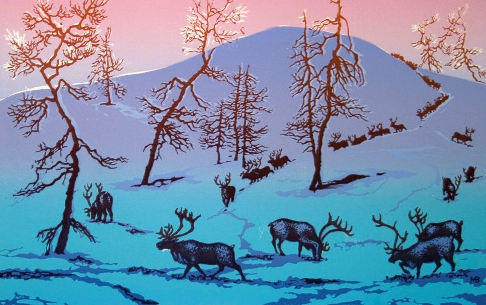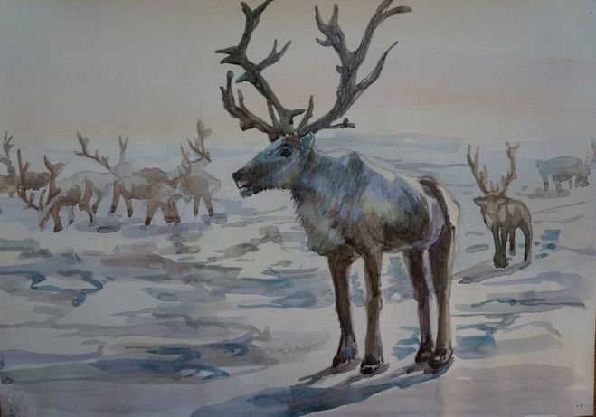 ![Северная олениха тундра художник]()