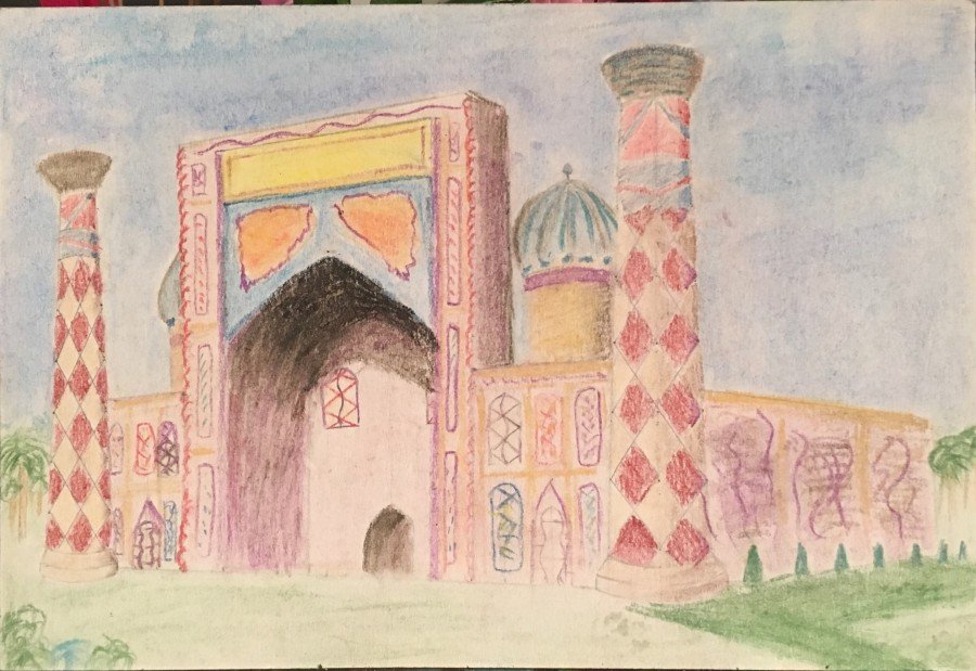 ![Рисунок детей Самарканд площадь Регистан]()