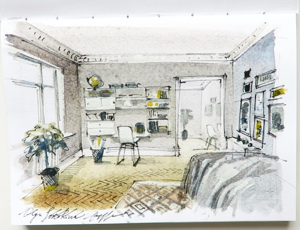 ![Акварельный набросок интерьера]()