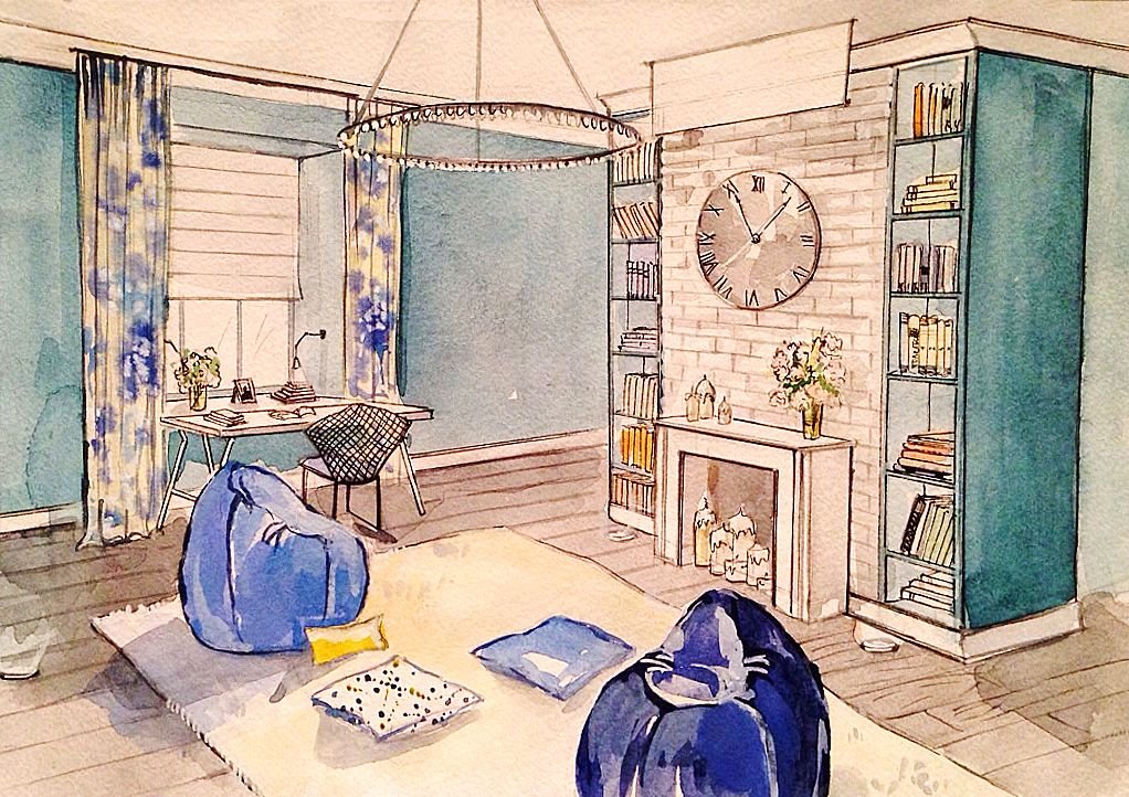 ![Акварельные скетчи интерьеров]()
