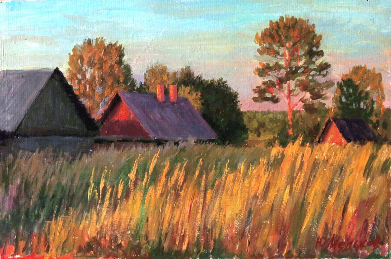 ![Деревенский пейзаж маслом]()