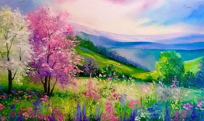 ![Весенний пейзаж красками]()