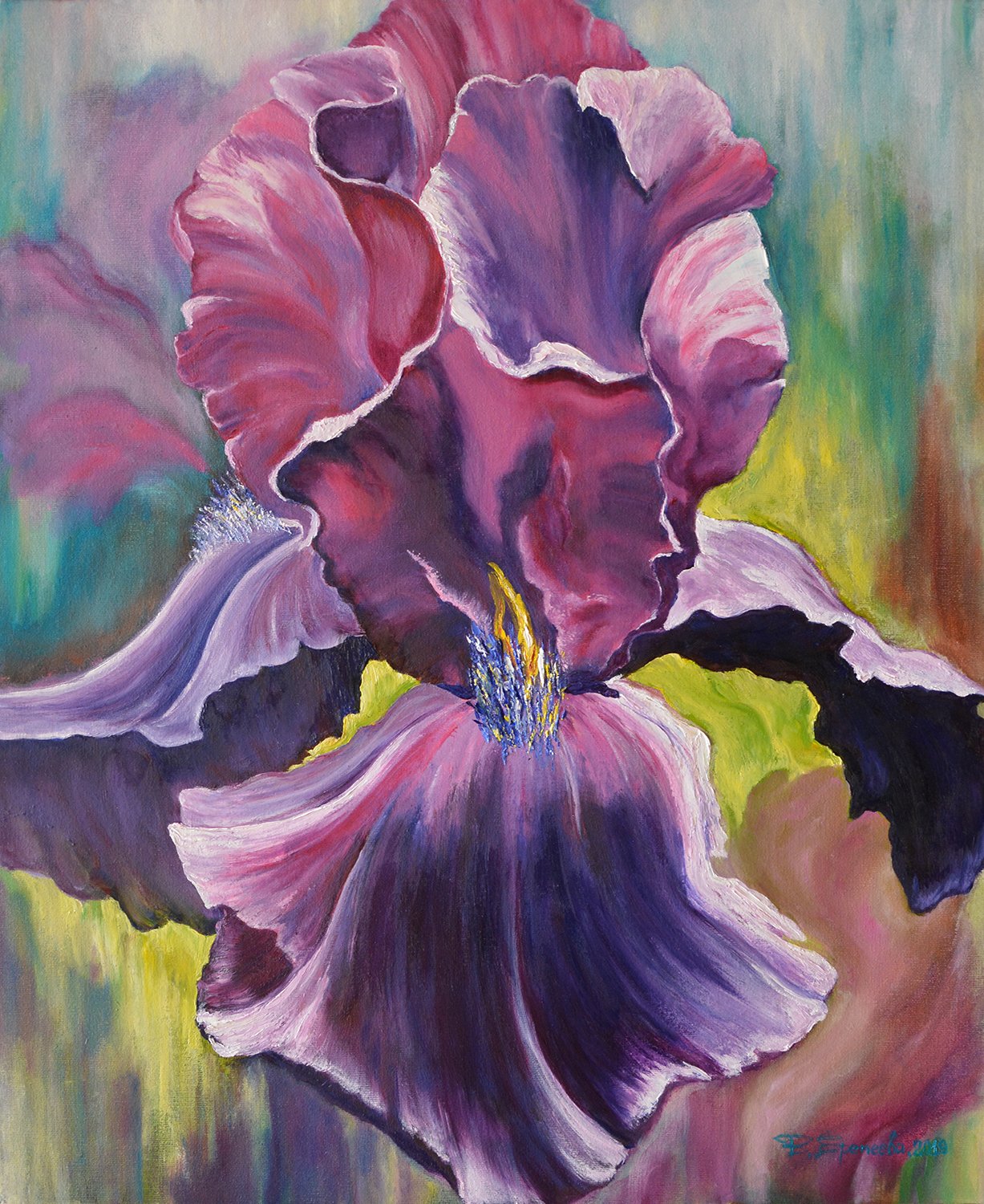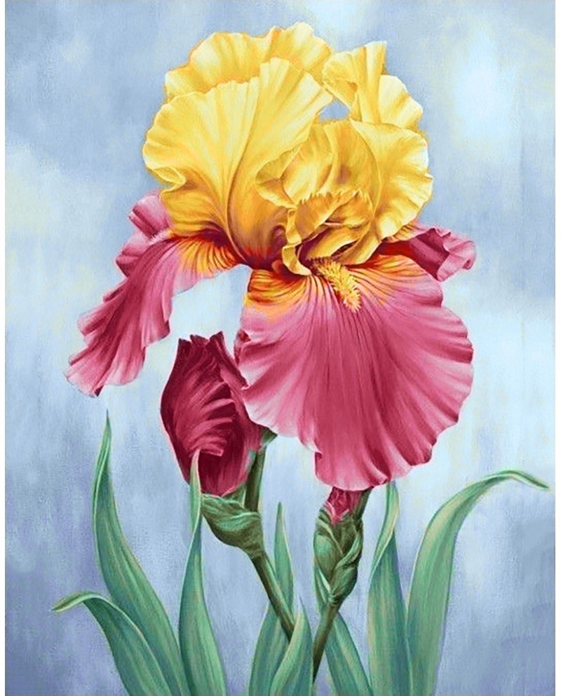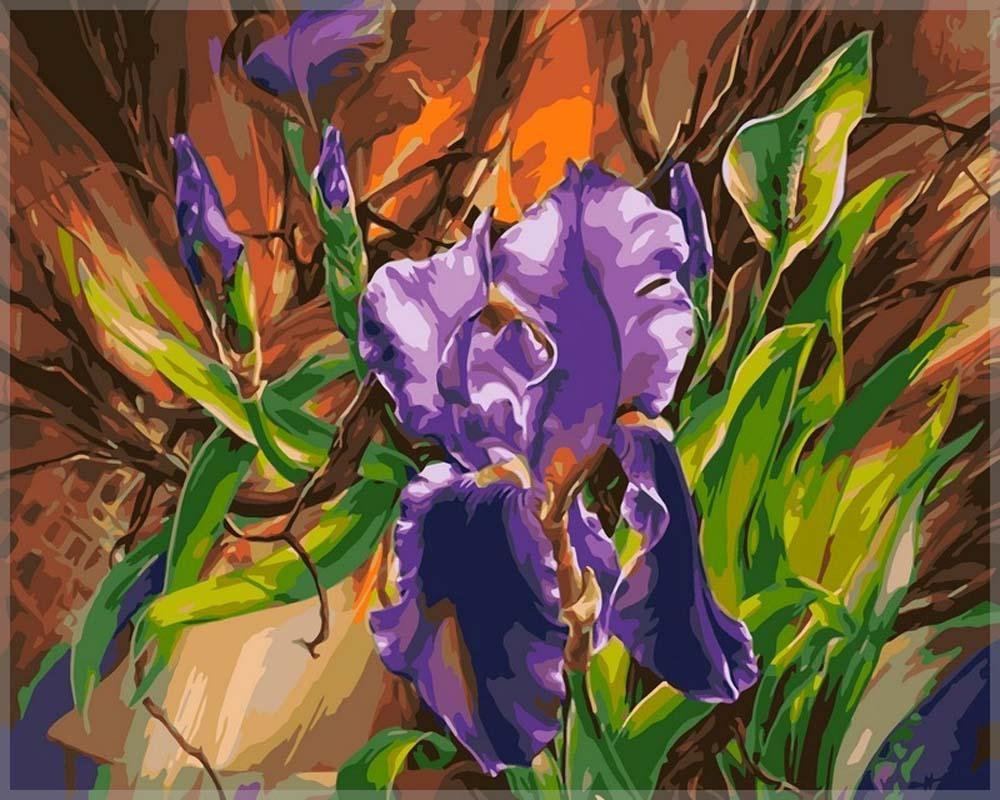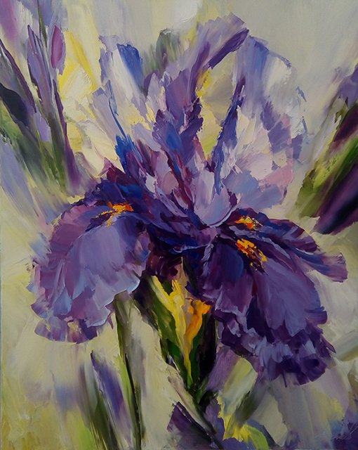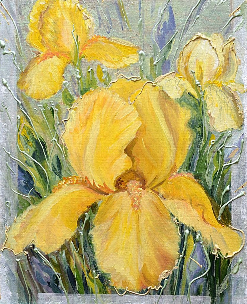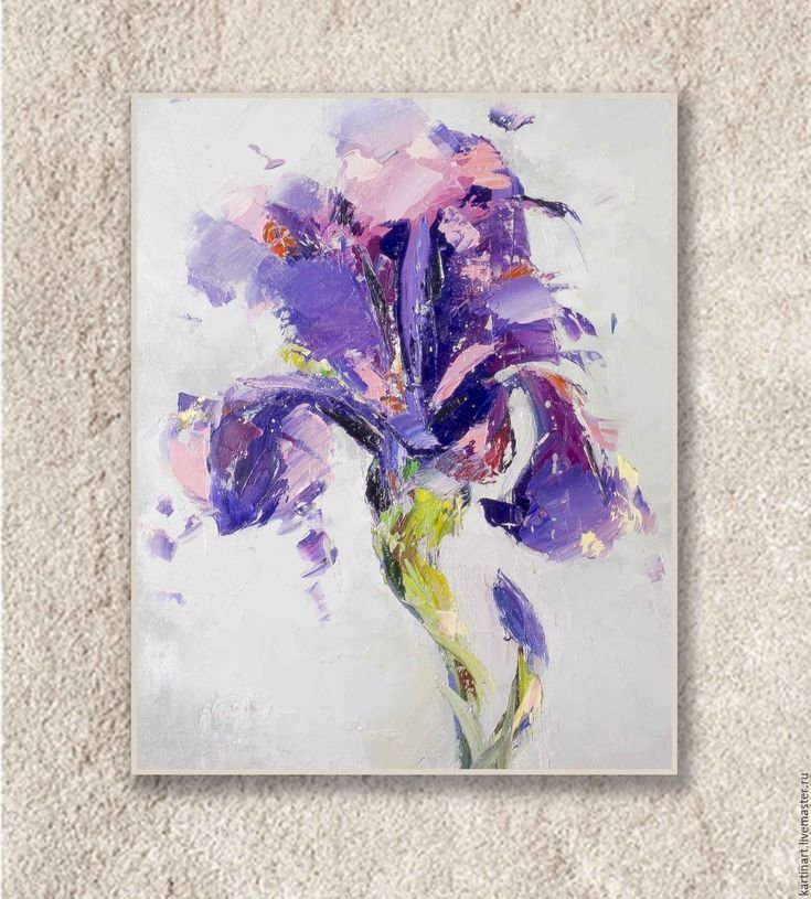 ![Ирисы цветы рисунок акриловыми красками на холсте]()