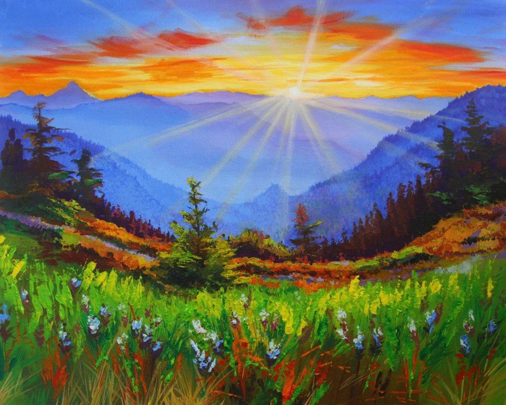 ![Пейзаж с солнцем живопись]()