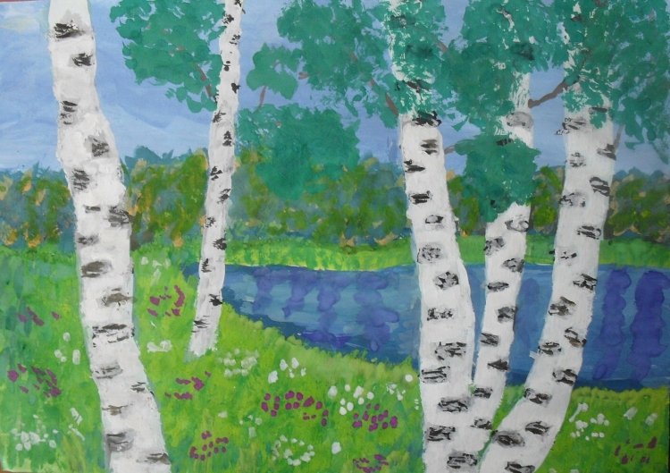 ![Пейзаж с березами гуашью]()