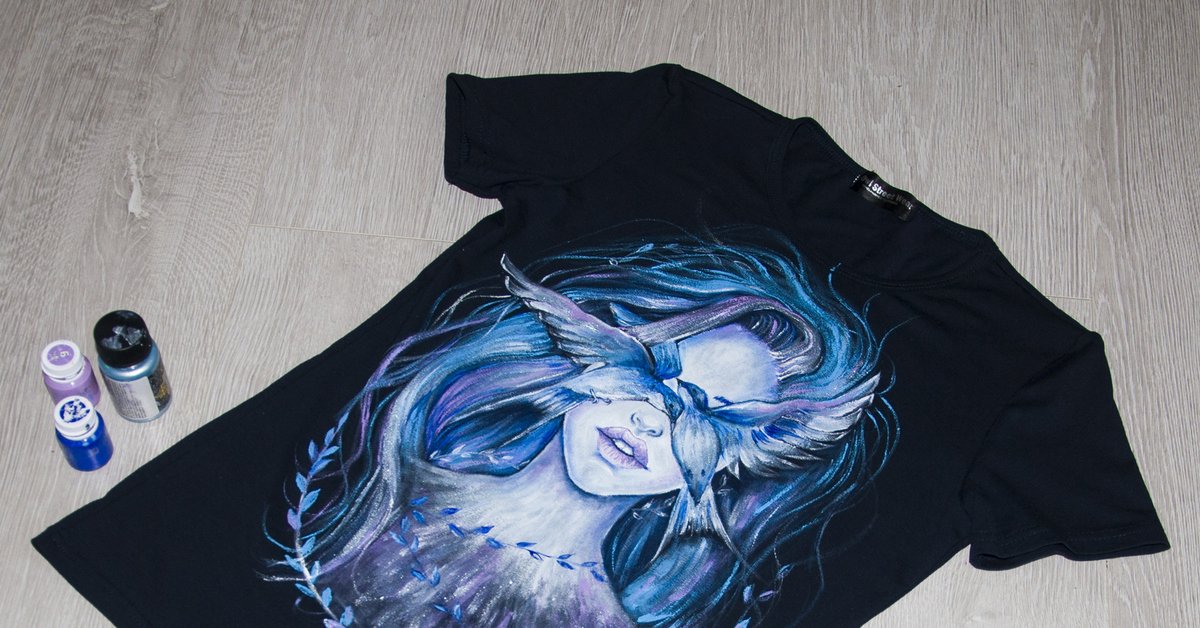 ![Роспись на черной футболке акриловыми красками]()