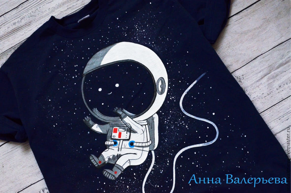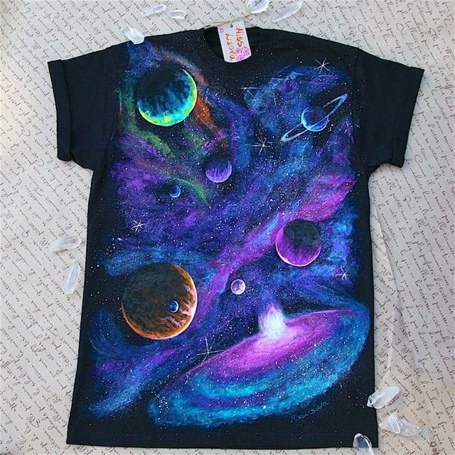 ![Космос на футболке акриловыми красками]()