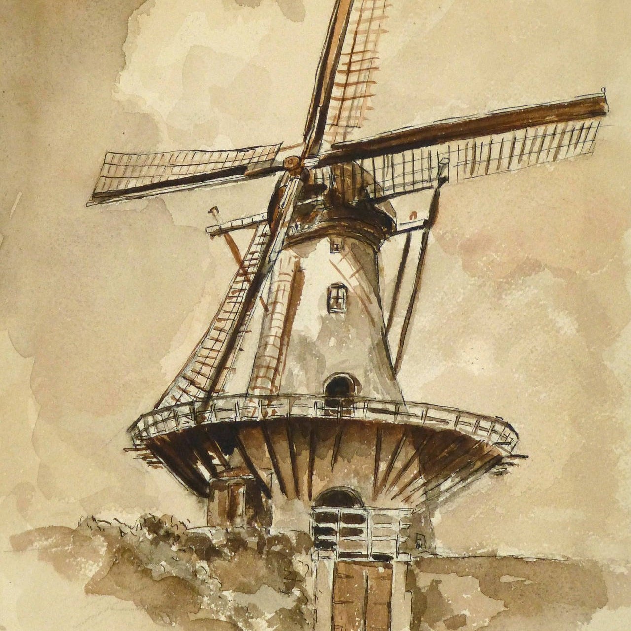 ![Мельница акварель]()