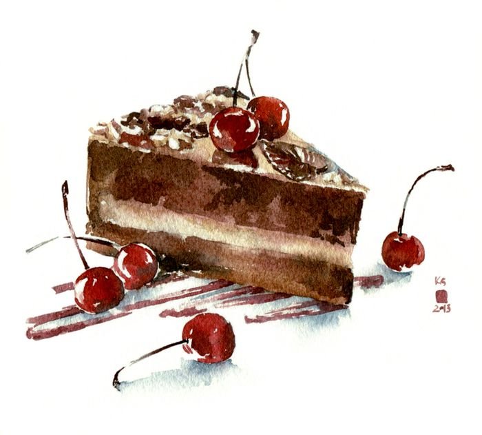 ![Торт с вишней акварель]()