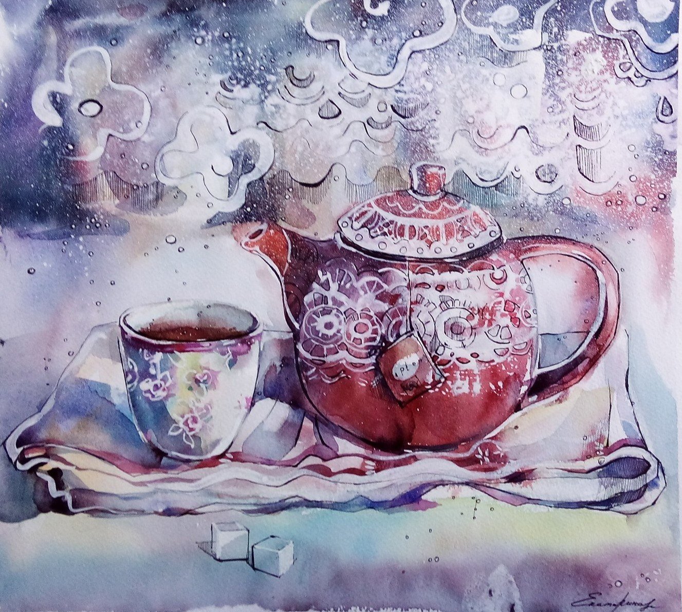 Чаепитие рисунок акварелью
