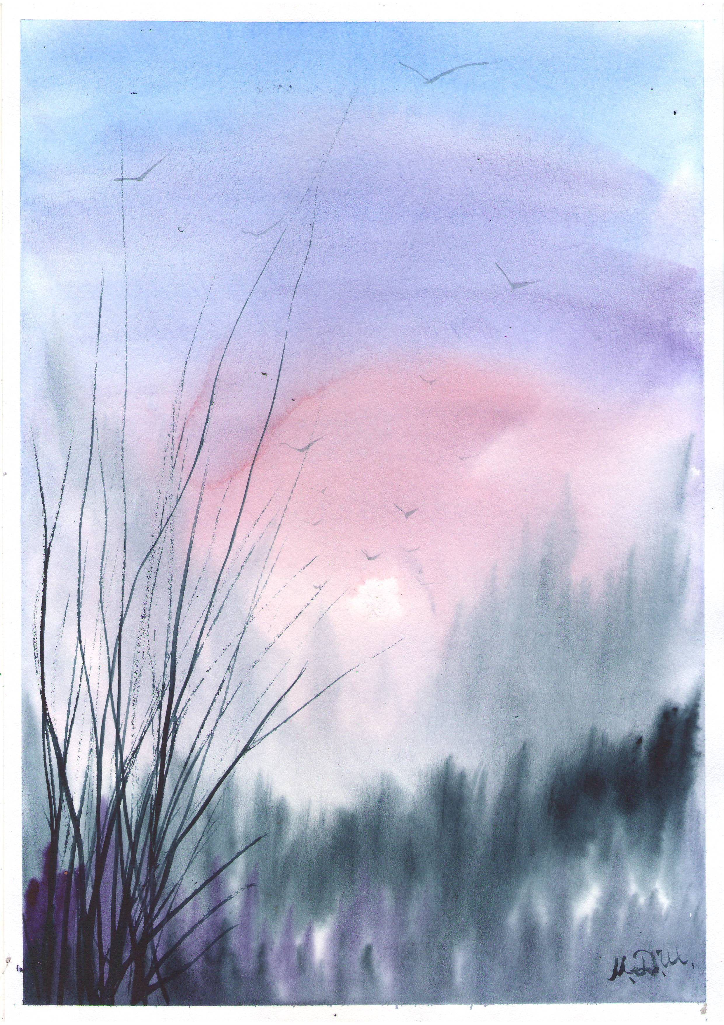 ![Рассветный пейзаж акварелью]()