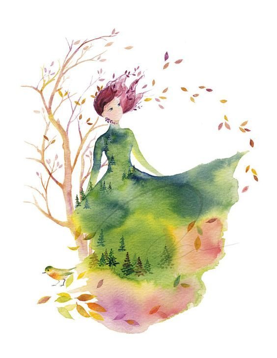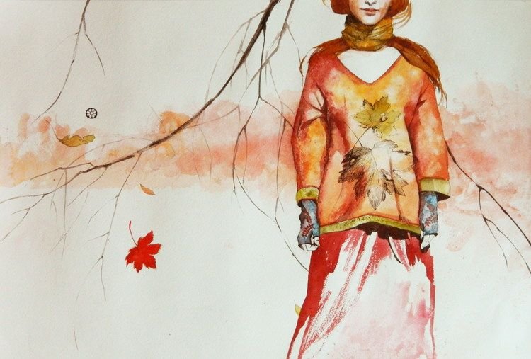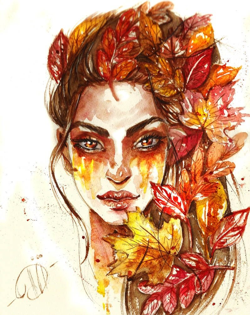 ![Женщина осень акварель]()