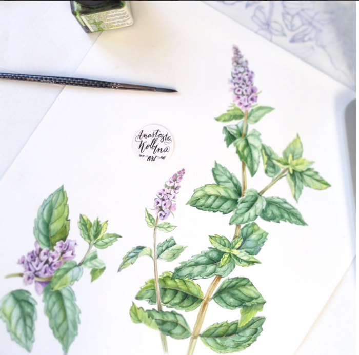 ![Мята зарисовка в акварели]()