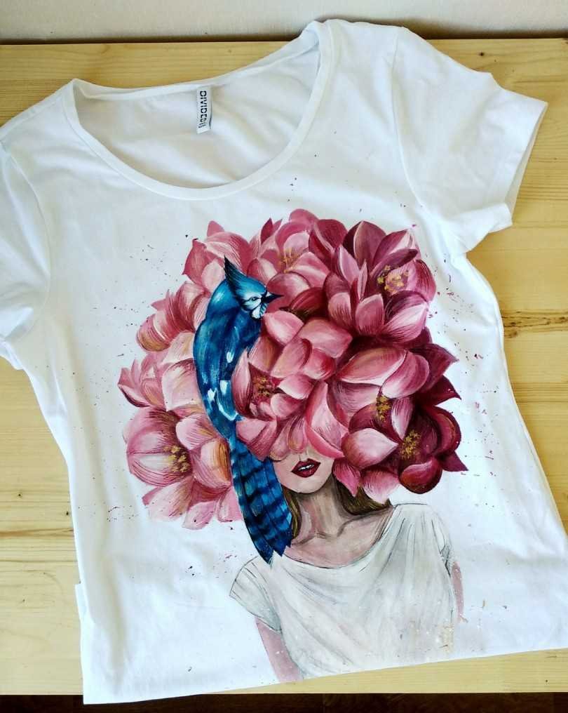 ![Цветы на футболке акриловыми красками]()