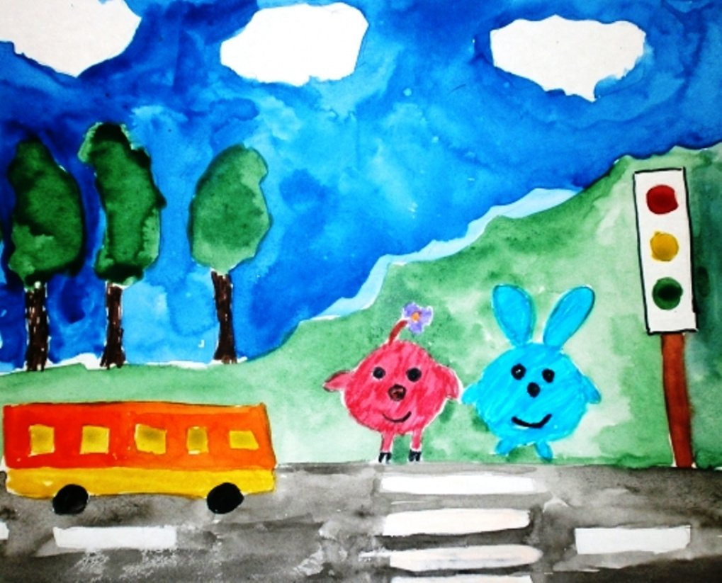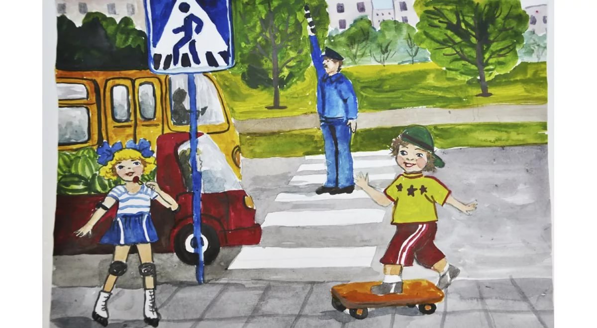 ![Рисунок на тему ПДД акварелью]()