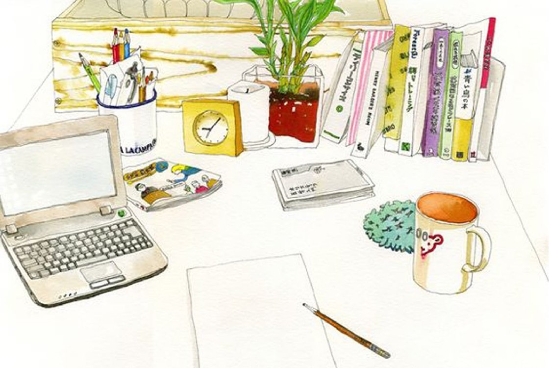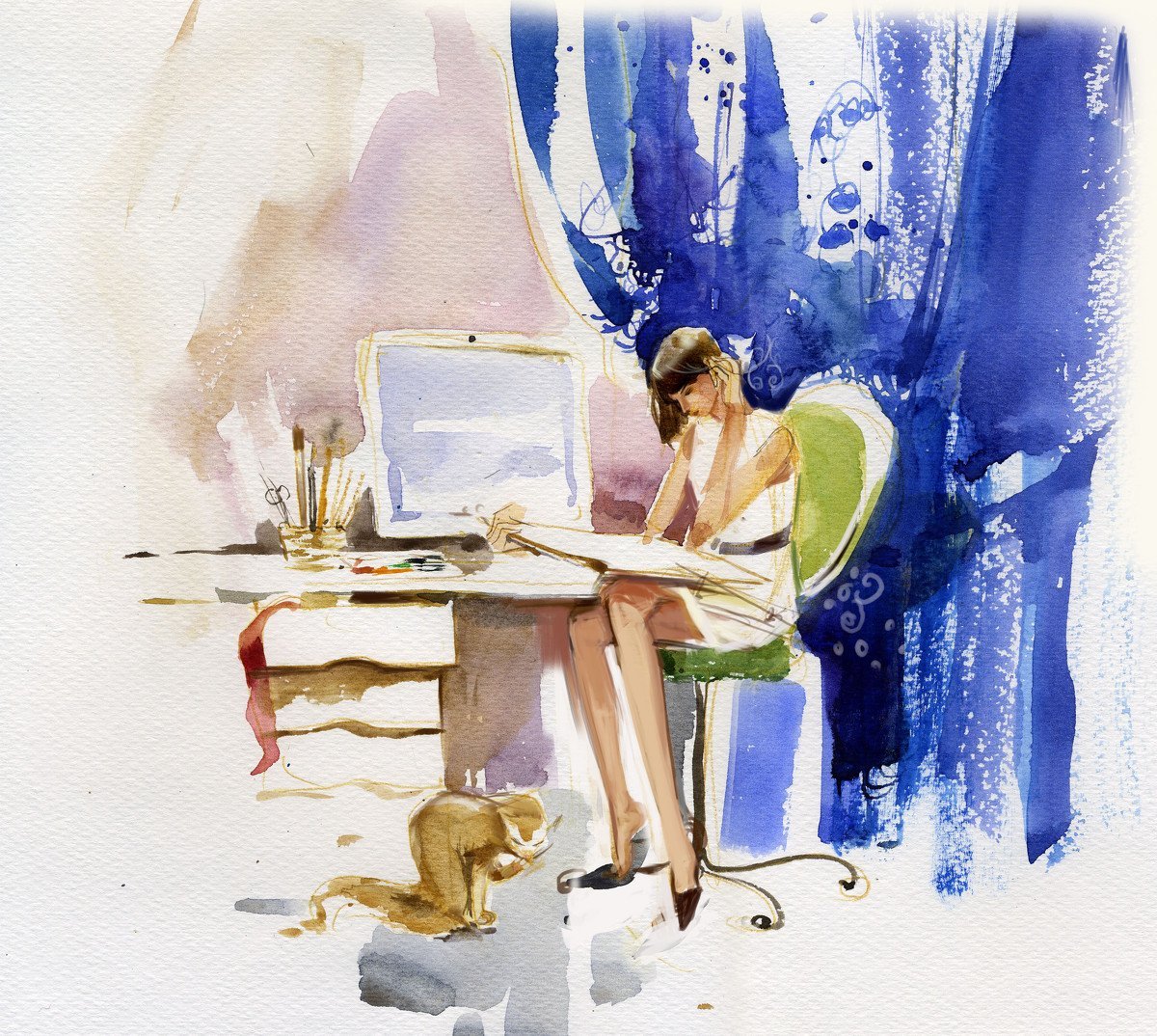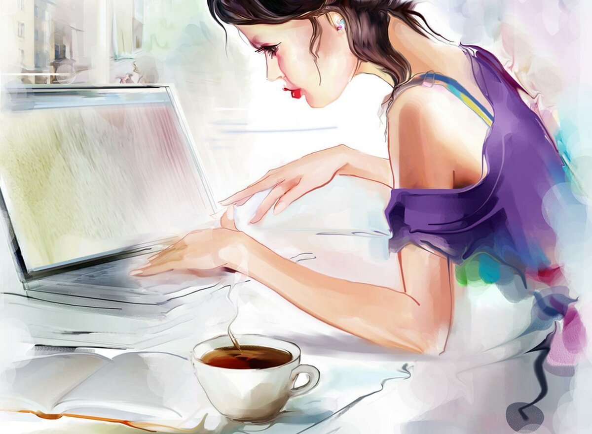 ![Девушка с ноутбуком акварель]()