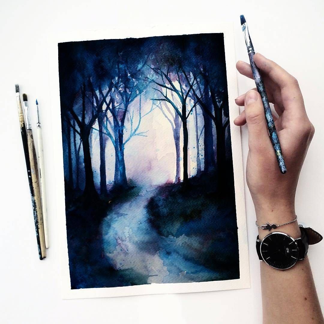 ![Ночной пейзаж акварелью]()